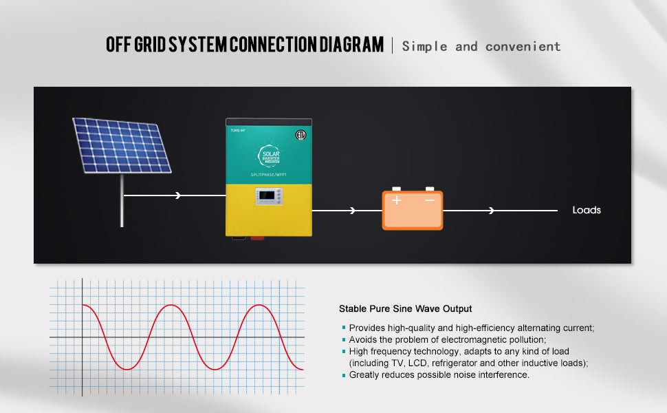 • [Voltaje de salida de CA de 120 V o 240 V disponible] Eficiencia de trabajo ≥ 85 %; convertir el voltaje nominal de CC en CA de 120 V o 240 V; incorporado un transformador de onda sinusoidal pura.