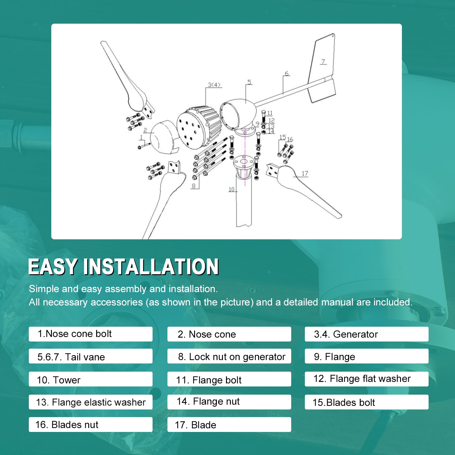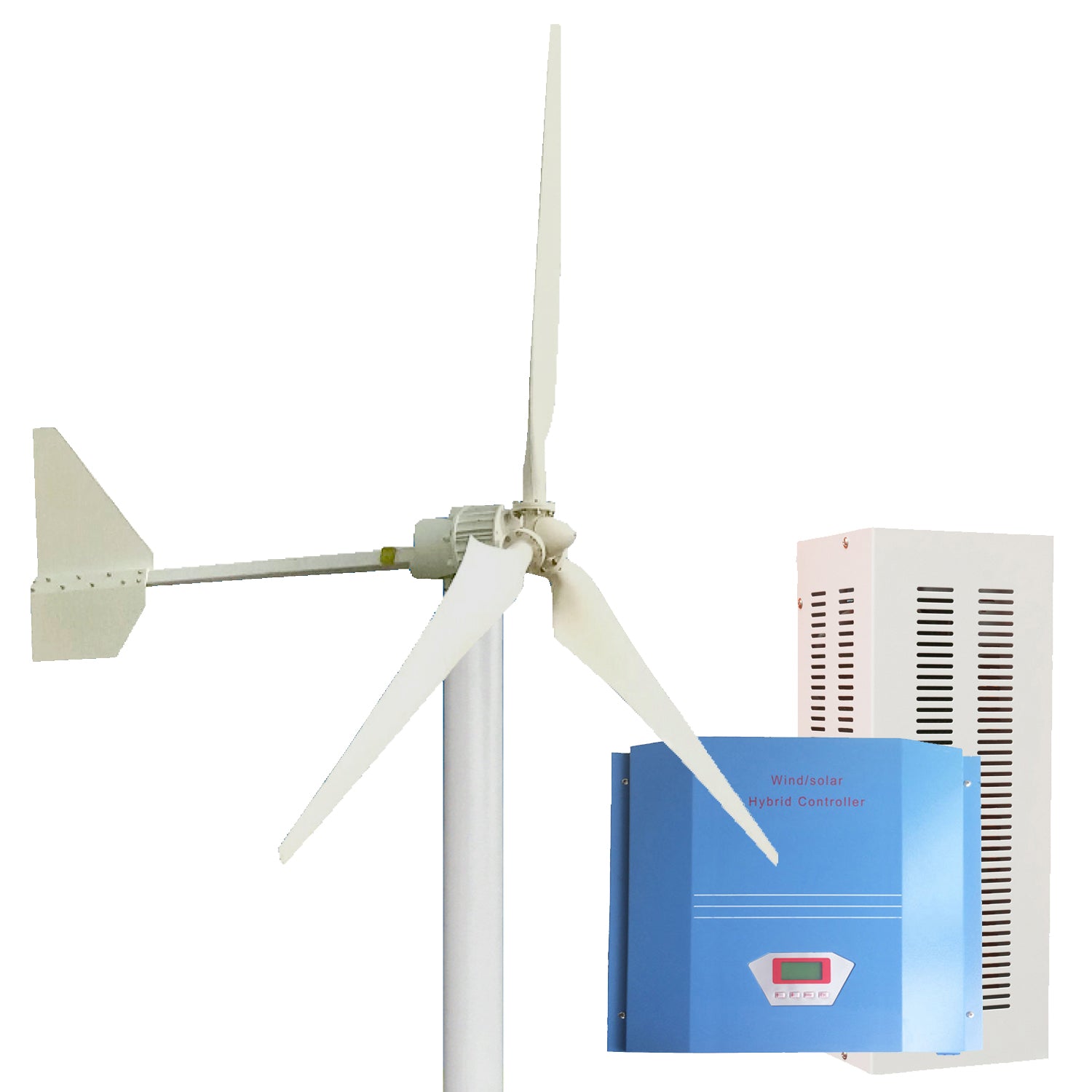 Apart from the wind turbine and controller provided, you also need a battery,(grid-tied system does not need battery),an inverter, a pole or a tower, and some cables to make them work normally in the wind energy system.